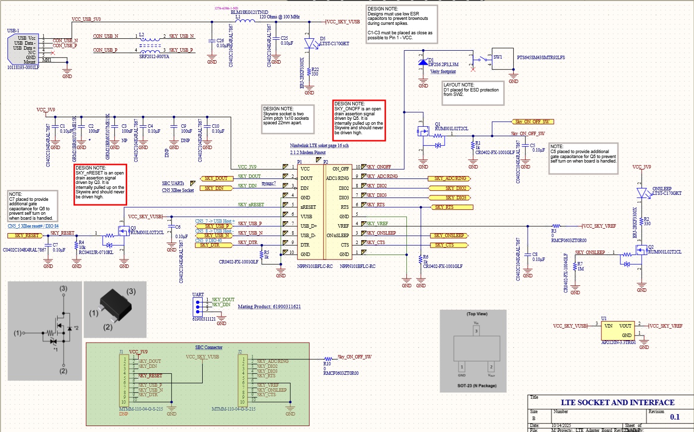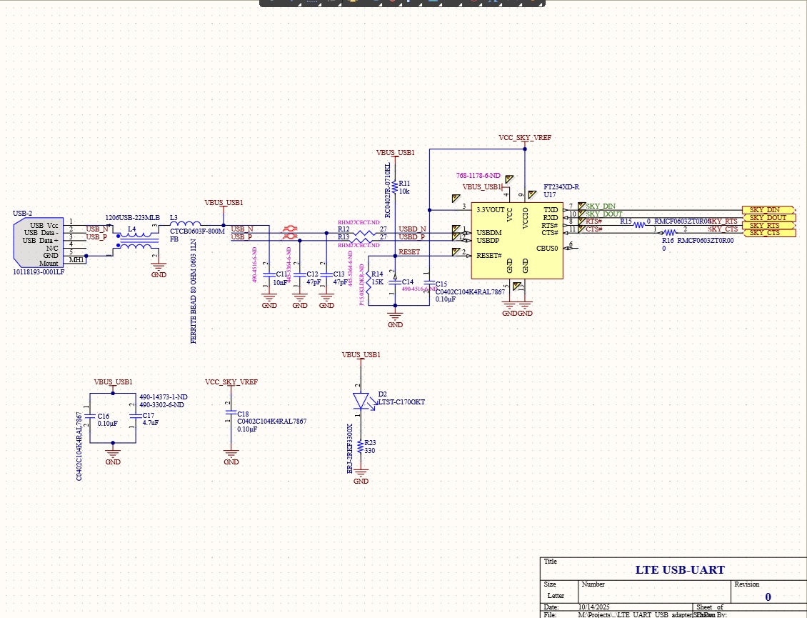 The LTE modem interface board is designed to relay LTE commands and data over USB or UART connection